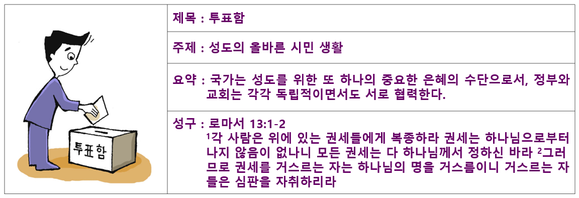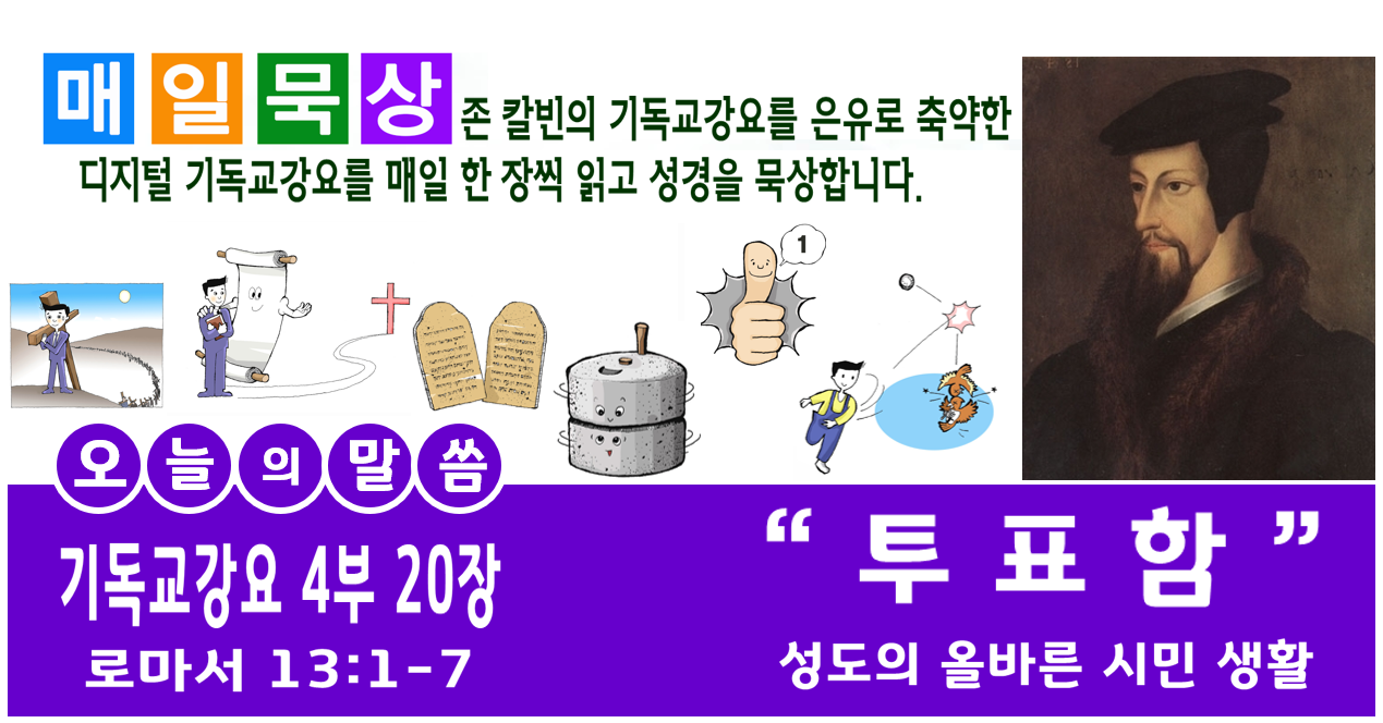 오늘은 제 4부 20장입니다. 기독교 강요 마지막 장이지요. 이 장에서는 시민 정부의 역할과 그리스도인의 시민적 의무에 대해 설명하고 있습니다. 곧 영적인 나라인 교회와 세상의 나라인 국가 속에서 어떻게 살아야 하는지에 대한 이야기이지요. 쉽게 말해 누구의 통치에 복종하며 살아야 하느냐는 말이지요. 그것을 ‘투표함’이라는 제목으로 공부해 봅니다. 투표함은 민주주의를 상징하는 물건입니다. 투표함은 국민 모두가 참여하여 나라 일을 결정하게 해주는 기적의 상자입니다. 투표함에서 국회의원이 나고 대통령도 납니다. 새 헌법이 나기도 하지요. 투표제도의 역사는 오래 되었습니다. 고대 그리스나 로마의 도시국가에서 이미 사용했었지요. 그러나 투표권은 근래에 이르기까지 특정한 사람들에게만 제한되어 왔었습니다. 모든 사람에게 투표권이 주어진 것은 그리 오래전 일이 아닙니다. 아무튼 투표함은 민주주의 정치의 상징이요 또 국가 통치 행위의 상징이 되기도 합니다. 우리 그리스도인은 어떤 원칙을 따라 정치를 하고, 시민생활을 해야 할까요? 그리스도인이 먼저 알아야 할 것은 영적 통치와 국가 통치는 서로 다르지만 서로 반대되지 않는다는 사실입니다. 성도에게는 이중의 통치가 있습니다. 하나는 영적 통치이지요. 우리의 속 사람, 즉 영혼과 영생에 관계된 통치입니다. 또 하나는 국가 통치입니다. 우리의 외면적 생활, 즉 시민 생활의 정의와 외적 도덕성만을 다루는 통치입니다. 이 두개의 영역은 서로 밀접히 관계되어 있습니다. 그러므로 서로를 연결시켜 생각하지 않을 수가 없습니다. 어떤 야만인들(재세례파)은 하나님이 제정하신 국가 제도를 무시하고 무너뜨리려고 날뜁니다. 또, 어떤 아첨꾼들(마키아벨리 등)은 군주의 권력을 과장하여 하나님의 통치권에 대립시키기를 주저하지 않습니다. 만약 이 두 가지 해독을 제거하지 않으면 우리의 순수한 믿음도 사라질 것입니다. 그리고 하나님이 인류에게 국가 제도를 주신 이유를 알면 알수록 인류에 대한 하나님의 사랑이 얼마나 크신지를 알게 될 뿐만 아니라, 우리의 경건에도 불이 붙고 하나님께 대한 감사가 충만해 질 것입니다. 우선 두 통치의 관계를 말하려면 서로 다른 점부터 이야기 해야 합니다. 그 둘은 서로 성질이 전혀 다르기 때문에 어리석게 혼동하면 안됩니다. 어떤 자들은 미련하게도 복음이 주는 자유를 세상의 집권자들이 방해한다고 생각합니다. 그래서 그것들이 전혀 없는 세상을 꿈꿉니다. 그러나 그것은 이 세상에서 몸 없는 영혼을 꿈꾸며, 현세 없는 내세를 꿈꾸는 것과도 같습니다. 몸과 영혼, 그리고 현세와 내세는 완벽하게 공존합니다. 그러므로 그리스도의 왕국을 이 세상의 초보적인 제도에서 찾으며 거기에 한정하려는 것은 유대적인 망상입니다. 성질이 전혀 다르지만 그리스도의 왕국과 세상 나라는 서로 완벽하게 공존합니다. 따라서 몸으로는 세상의 제도나 권세 아래 철저히 묶여 있는 신자라도 영으로는 그리스도께서 주시는 자유를 완전히 누릴 수 있습니다. 그래서 바울은 세상에서는 여전히 종의 처지에 있는 신자들에게 이제 다시는 ‘(영적으로) 종의 멍에를 매지 말라’고 명령하는 것입니다(갈5:1; 고전7:21; 갈3:28; 골3:11). 우리의 몸과 영의 동거만큼이나 신비한 공존이지요? 그러나 그러면서도 그 두 통치는 서로를 반대하고 대적하는 것이 아니라 서로 협조합니다. 영적 통치는 이 지상에 있는 우리 안에 이미 하늘 나라가 시작되게 만들고, 이 죽을 생명 속에 영원불멸의 복을 어느 정도 예상할 수 있게 합니다. 그리고 국가 통치는 하나님께 대한 예배를 존중하고 보호하며, 건전한 교리와 교회의 지위를 지켜주며, 우리를 사회생활에 적응하게 해주며, 우리의 행위가 사회 정의에 맞도록 이끌어 주며, 우리가 서로 화해하고 평화를 유지하고 증진시키게 해줍니다. 어떤 자들은 그런 국가 통치의 도움이 전혀 필요 없는, 교회만이 통치하는 완벽한 사회를 주장하지만, 만약 그럴 수 있다면 하나님은 우리를 이 세상의 ‘나그네’라고 부르지 않으셨을 것입니다. 세상에 있는 교회는 사회의 악행을 억제해주는 세상 통치의 협조가 필요합니다. 그러니까 국가 통치는 하나님을 대리하는 권력으로서 꼭 필요합니다. 따라서 정부를 폐지하려는 행위는 야만적입니다. 그것은 우리에게서 빵과 물과 태양과 공기를 거부하는 것과 마찬가지입니다. 인간 사회에서 정부가 하는 역할과 위치는 그런 것들보다도 더 중요합니다. 즉 정부는 우상숭배나, 하나님의 이름에 대한 모독, 하나님의 진리에 대한 훼방, 그리고 그 밖에 종교에 대한 공공연한 방해가 사회에 발생하거나 만연하지 않도록 하고, 치안을 유지하며, 시민의 재산을 보호하고, 인간 상호간의 선한 교제를 가능하게 하며, 정직과 겸양의 덕을 보존케 합니다. 요약하면, 그리스도인들이 공개적으로 마음껏 종교 생활을 할 수 있도록 해주어 사회에 인간성이 보존되도록 하는 것입니다. 물론 정부가 하나님께 대한 예배나 경건에 대해 멋대로 법을 제정할 수는 없지만, 하나님의 율법에 포함된 참 종교를 노골적으로 그리고 공개적으로 모독하