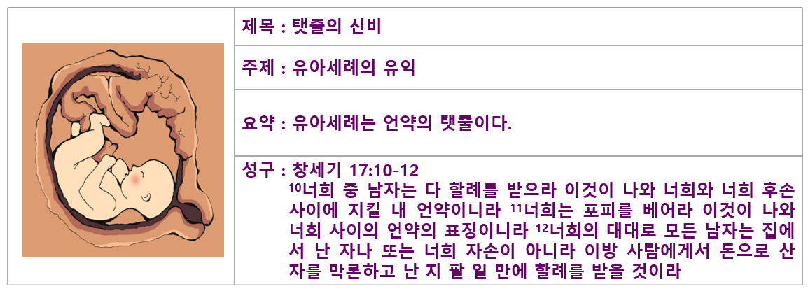 할례도 다음 몇 가지 약속을 담고 있습니다. 첫째 죄를 씻어 주신다는 것입니다. 아브라함이 받은 영생의 약속을 인친 것이 바로 할례인데(창17:7,10; 눅20:37-38; 마22:32; 엡2:12), 영생에 들어가는 첫 걸음이 죄를 용서 받는 것이기 때문입니다. 둘째 육을 죽이고 중생하게 해 주는 것입니다(창17:1; 신10:16; 30:6; 렘4:4; 겔16:30). 셋째 교회에 가입하는 표로서, 하나님의 가족으로 선택되었다는 것을 확인해줍니다. 또한 자신들에게는 하나님을 섬기는 무리에 참가하겠다고 고백하는 표가 됩니다. 이처럼 우리가 세례에서 받는 영적 약속을 우리 조상들은 할례에서 받은 것입니다. 그리고 그 ‘아브라함의 복’을 모든 족속에게 나누어 주신 그리스도께서 곧 세례와 할례 모두의 유일한 기초이십니다(창12:2-3; 갈3:14).